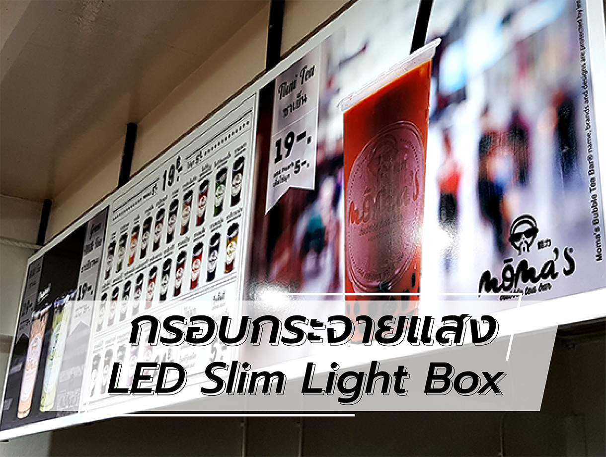 กรอบกระจายแสง LED Slim Lighbox เป็น ป้าย LED แบบบาง ต้องการประหยัดพื้นที่ เพื่อทำให้ดูสวยงาม เพราะป้ายจะมีขนาดบางกว่า ป้ายกล่องไฟแบบธรรมดา เป็นงานป้ายไฟแบบที่ใช้หลอดไฟ LED ร่วมกับเทคโนโลยีแผ่นกระจายแสง ช่วยเพิ่มความสว่างให้กับภาพ ทำให้ภาพดูโดดเด่นสะดุดตา สวยงามทันสมัย หรูหรามีระดับ แผ่นกระจายแสงมีคุณสมบัติพิเศษในการนำแสง โดยเมื่อวางหลอดไฟ LED ที่ขอบแผ่น แผ่นนำแสงที่เป็นสีใสก็จะสว่างขึ้นในทันที ไฟ LED จะเดินรอบแผ่นนำแสงยิงไฟขนานเข้าแผ่น ซึ่งแผ่นนำแสงคือแผ่นอะคริลิคเคลือบสารที่นำไปผ่านการยิงสกรีนดอทหรือเส้นนำแสงด้วยเลเซอร์ที่จะ ช่วยให้รับแสงจาก LED ด้านข้างมาทำ Effect สะท้อนขึ้นหน้าแผ่นสว่างไปทั่วแผ่น โดยสามารถนำแผ่นนำแสงไปใช้ในอุตสาหกรรมป้ายโฆษณาและ งานแปรรูปต่างๆ เช่น งานป้ายโฆษณาแบบาง งานป้ายโฆษณาติดฝาผนัง หรือ งานตกแต่งภายใน และที่สำคัญ กรอบป้ายไฟ LED กระจายแสง สามารถเปลี่ยนภาพได้ง่าย ประหยัดพลังงาน กรอบป้ายไฟแอลอีดี มีหลายรุ่นหลายขนาด มีความหนาเพียง 1.5-2.5 ซม. ขึ้นอยู่กับรุ่นและชนิดของกรอบเฟรม