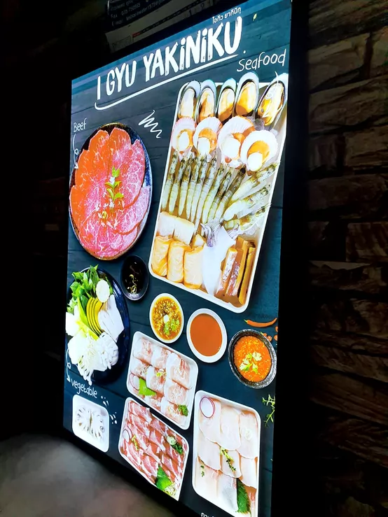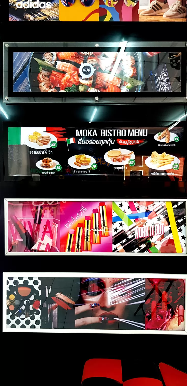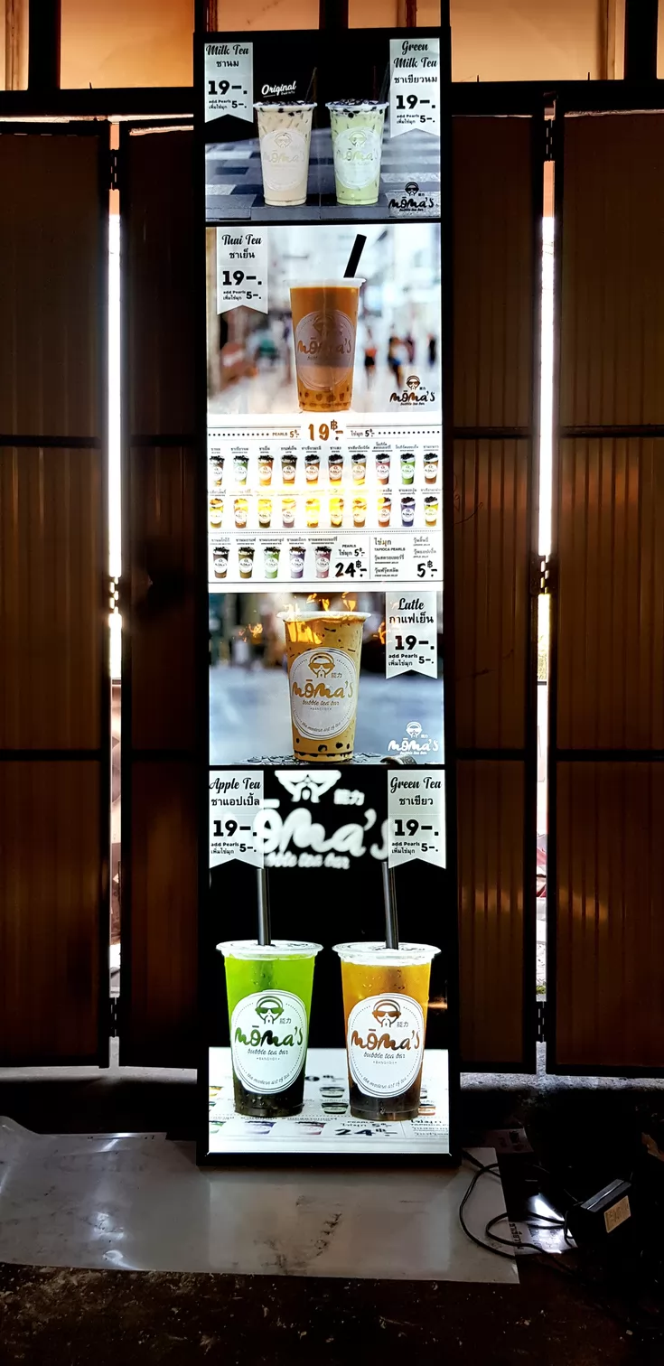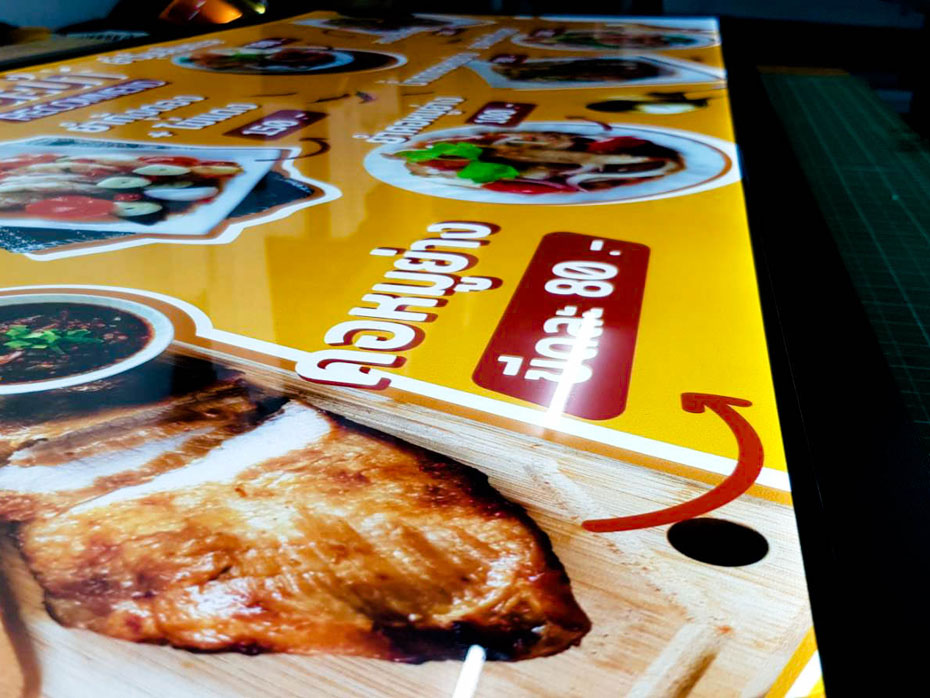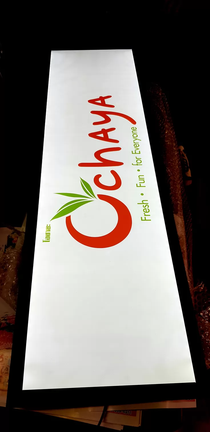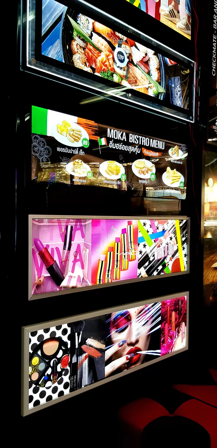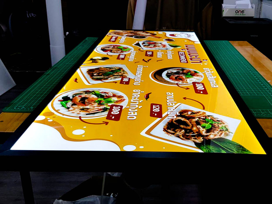 2. กรอบป้ายไฟแบบแถบแม่เหล็ก Magnetic Frame Light Box : เป็นกรอบกระจายแสง ที่ข้างในกรอบจะมีแถบแม่เหล็กติดไว้รอบๆกรอบเพื่อเอาไว้ยึดกับฝาด้านหน้า ซึ่งแผ่นปิดฝาด้านหน้าจะเป็นแผงอะคริลิคใส โดยแผงอะคริลิคจะติดตัวแถบแม่เหล็กไว้ เปิดฝาโดยใช้จุ๊บดูดสูญญากาศตัวกรอบจะเป็นเฟรมอลูมิเนียม มีความหนาเพียง 1.8 cm. และความหนาคิ้วนอกถึงด้านในภาพกราฟฟิก 2.7 cm. ไม่มีคิ้วหนา เปลี่ยนภาพพิมพ์ Backlit Filmได้ง่าย โดยใช้จุ๊บดูดสูญญากาศกดลงบนแผ่นอะคริลิคด้านหน้าสุด เพื่อดึงแผ่นอะคริลิคออก จากนั้น นำ Backlit Film วางทาบลงไปด้านในกรอบแล้วนำแผ่นอะคริลิคปิดทับไปเหมือนเดิมโดยกรอบเฟรมมี 2 สีให้เลือก คือ สีขาว และ สีดำ
