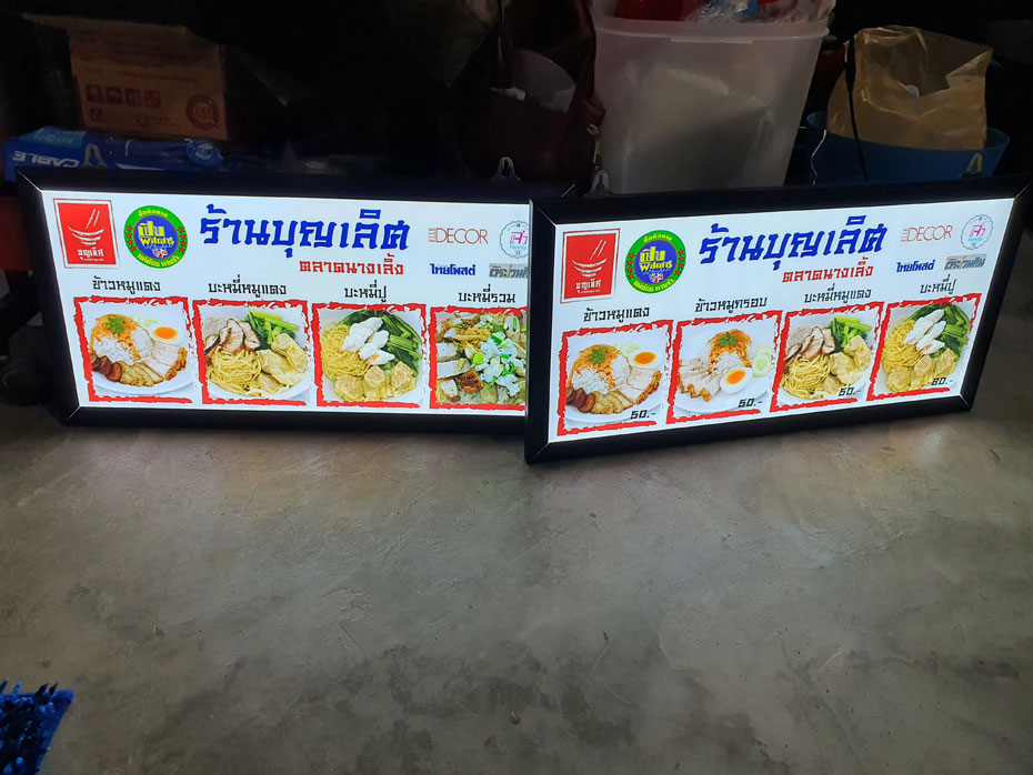 1. กรอบป้ายไฟแบบ ฝาเปิด-ปิด Snap Frame : ตัวป้ายเป็นโครงอลูมิเนียม ไม่เป็นสนิม ด้านหน้า จะมีลักษณะเป็น Snap Frame ฝาเปิด-ปิดเปลี่ยนภาพพิมพ์ Backlit Film ได้ง่าย โดยเปิดที่ขอบด้านข้าง ทั้งสี่ด้าน กรอบบางเบา ความหนาขอบข้างเพียง 1.5-2.2 cm. แนบผนังไม่เทอะทะ ใช้ไฟเพียงแรงดันไฟฟ้าต่ำ12V DC มีให้เลือกหลายสี นิยมนำไปใช้เป็นป้ายไฟแขวน ป้ายไฟติดผนัง เหมาะกับงานป้าย Display ป้ายเมนู ร้านอาหารเพื่อการโฆษณาโปรโมชั่นที่มีการปรับเปลี่ยนหมุนเวียนบ่อยๆกรอบ Snap Frame ของทางร้านจะมี 2 แบบ (เรียกตามความกว้างของขอบด้านหน้า)